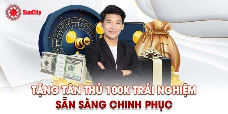 Suncity mang đến chương trình khuyến mãi đặc biệt dành cho người chơi mới. Chỉ cần đăng ký tài khoản thành công và xác nhận số điện thoại, bạn sẽ được nhận ngay 100.000 đồng để trải nghiệm các trò chơi tại nhà cái. Số tiền này có thể được sử dụng để đặt cược vào bất kỳ loại hình cá cược nào, từ game bài, thể thao đến slot game.